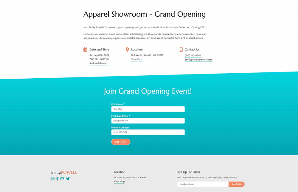 Emily Powell, a travel blogger and photographer, announces a Grand opening of her showroom. I built a responsive microsite for this event.